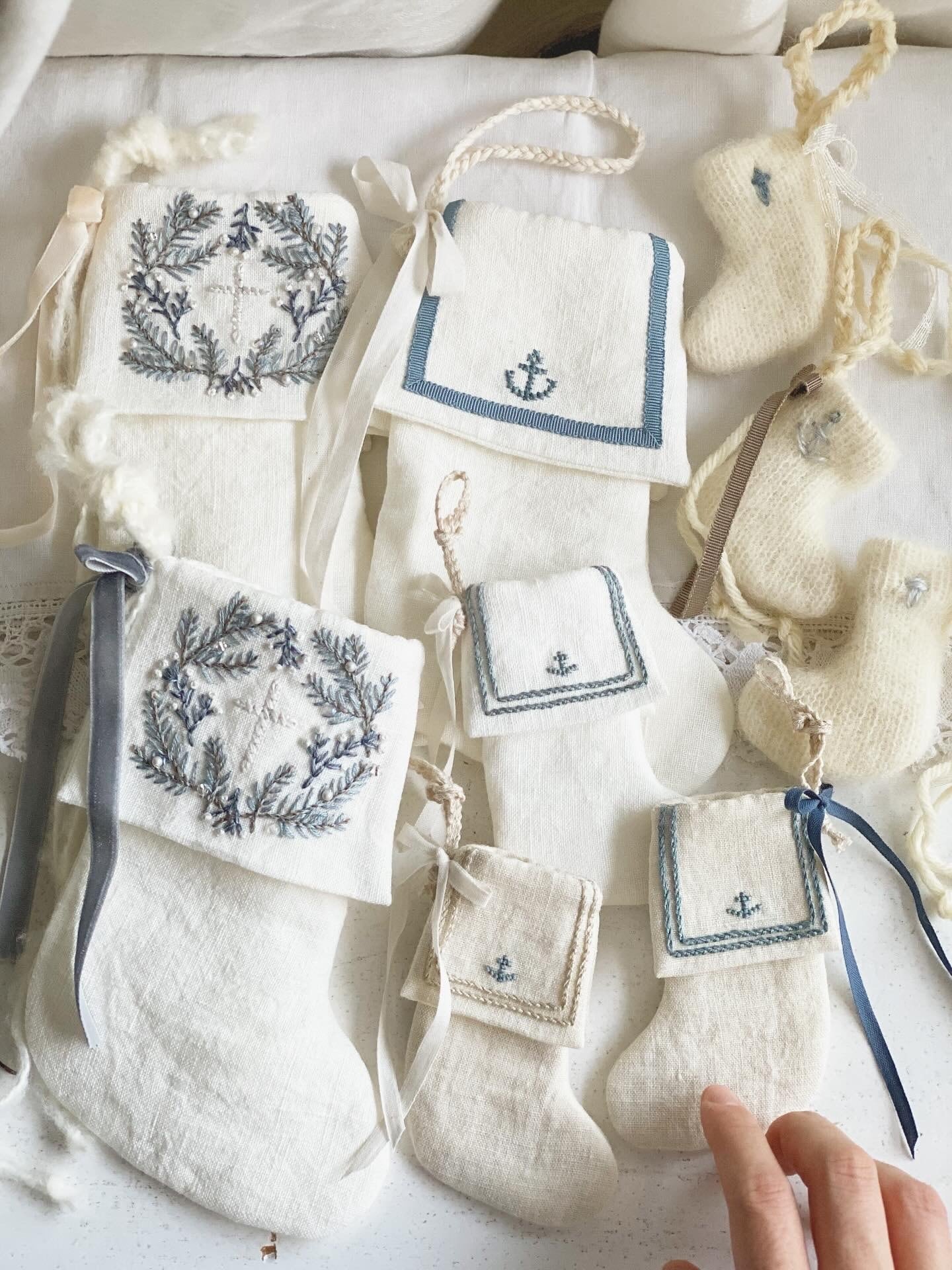 . . ノエルに海を、ひと匙。 セーラーな靴下オーナメントをお作りいたしました。マリンな靴下さんと、素敵な冬をお楽しみくださいね。 手触りのいいリネンに、セーラー襟をモチーフにした刺繍をほどこしました。 ツリーやリースのアクセントにしたり、壁やドアにちょこんと飾っても可愛いですし、お出かけのバッグにつけて、冬のお散歩に連れて行ってあげてもいいですね。 右向き、左向き、どちらで飾ってもいいように、表と裏と、どちらも刺繍をお入れしています。 靴下の中に、小さなプレゼントを忍ばせても◎ 冬の時間を、刺繍のある景色とご一緒にゆっくりとお楽しみくださいね。 . . ☩ 作品のサイズ 約17×12cm ☩ お送り方法 クリックポスト、レターパックプラス、または宅配便でのお届け予定です。ご指定は出来ませんので、ご了承くださいませ。複数お買い物をして下さった場合は、同梱でお届けする場合がございます。また、送料の関係でそれぞれお送りする場合もございます。なお海外への発送には対応しておりません。ご了承ください。 . . ∞