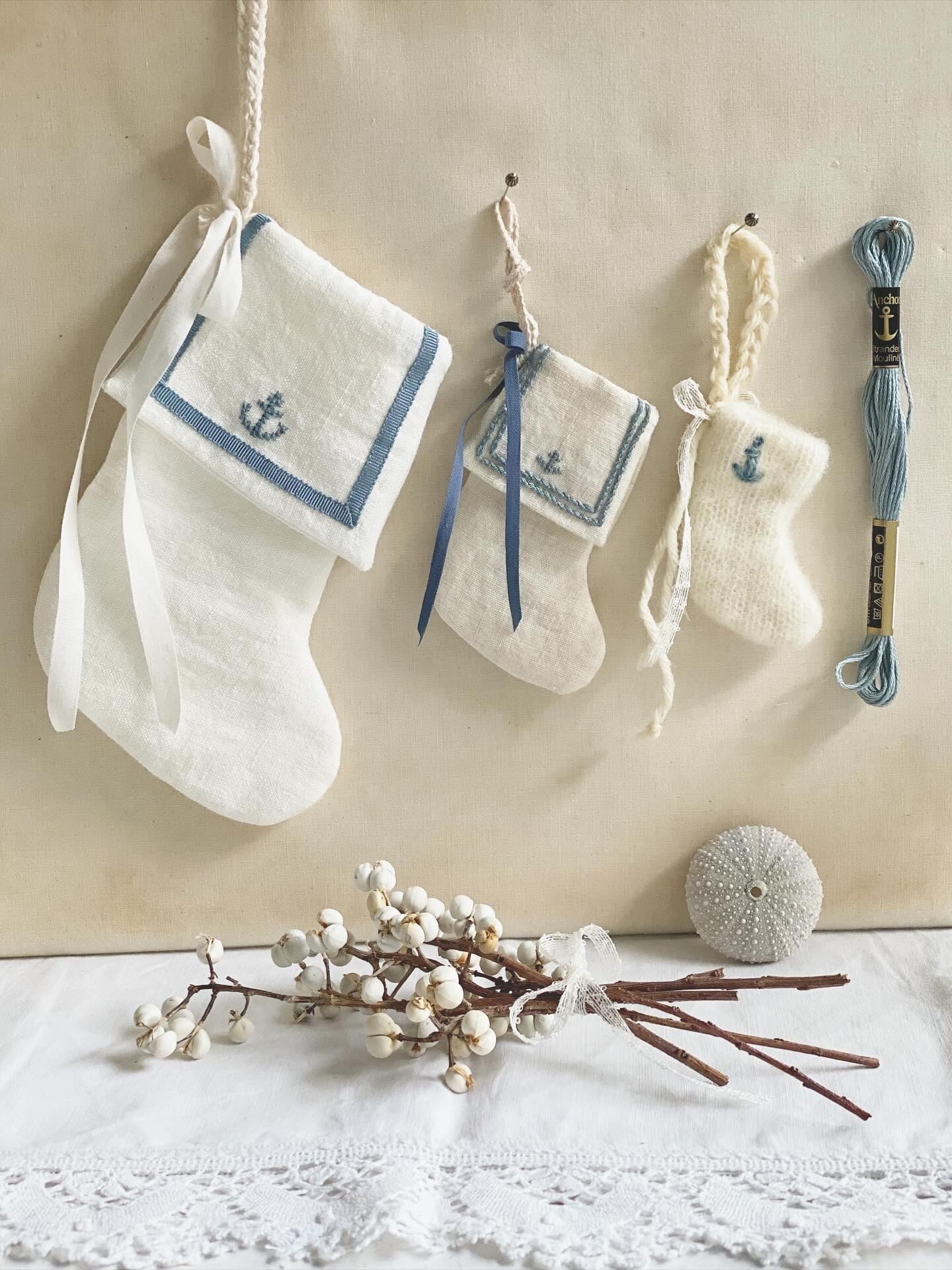 ニットにウール刺繍をワンポイント刺繍をしました、小さな靴下オーナメントをお作りしました。